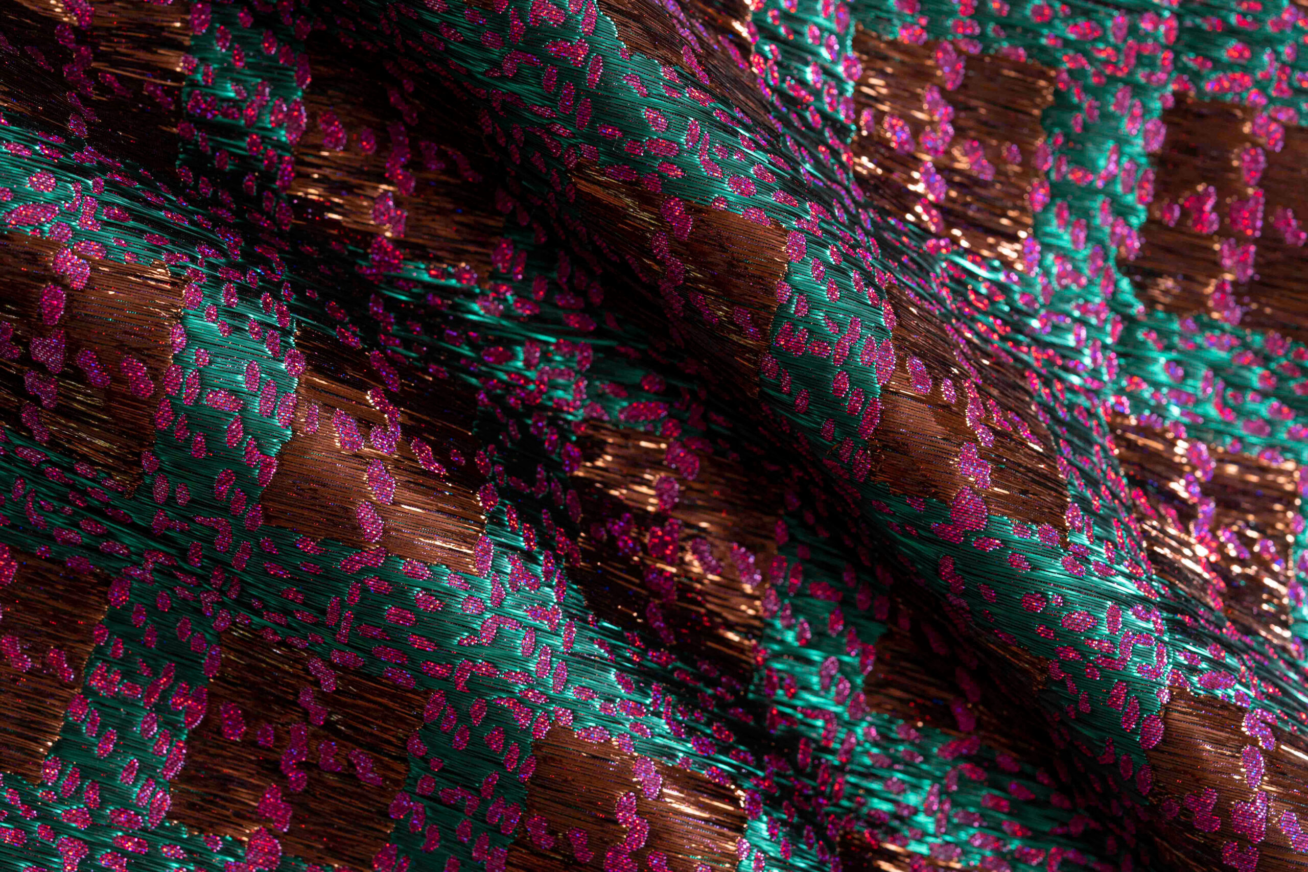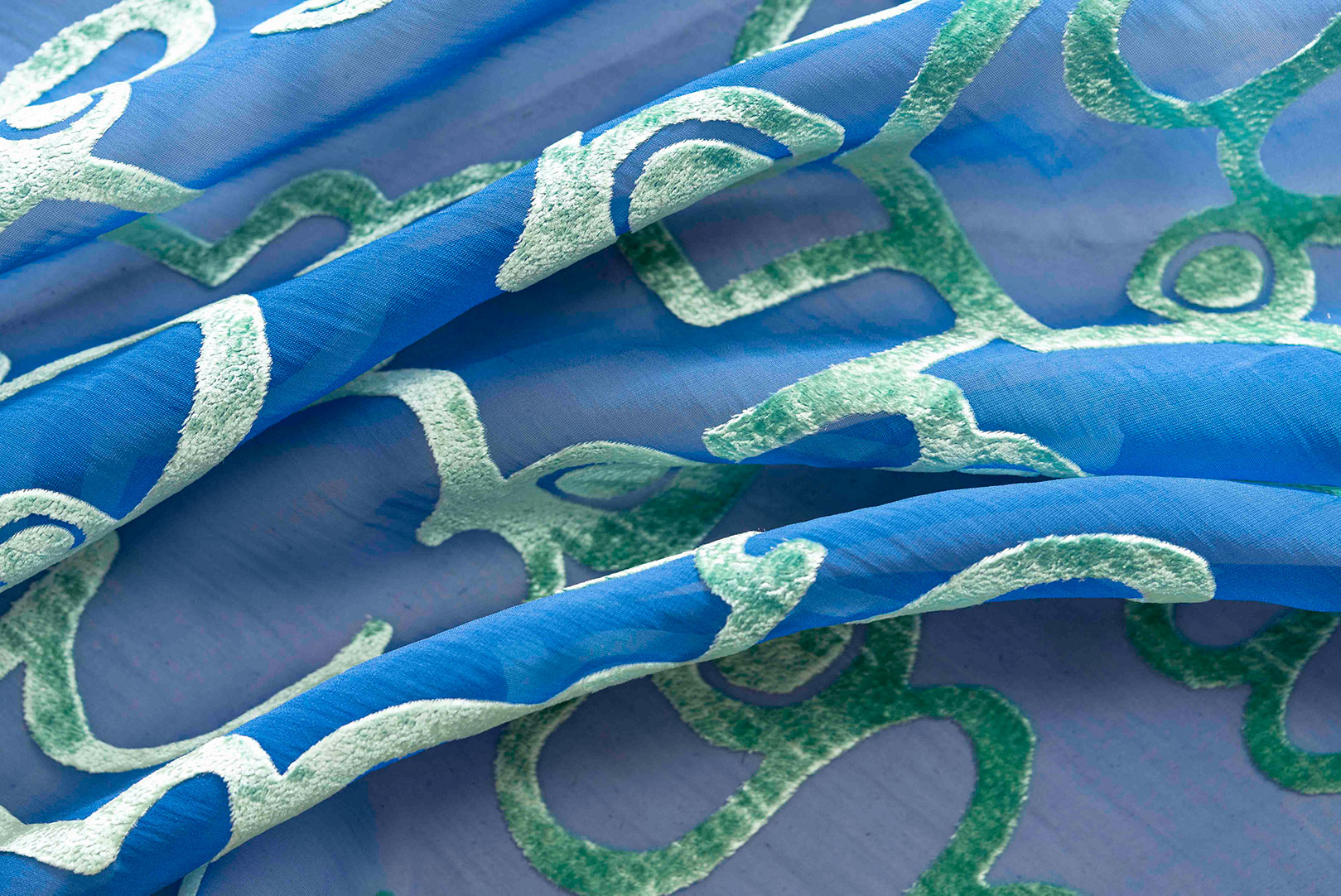 The jacquard proposal, though a capsule, is very varied in quality and texture. We find chiné-effect fil coupé georgette, fluid satins with modern embossed designs, iridescent matelassé coupé and floral brocades in vibrant colors.