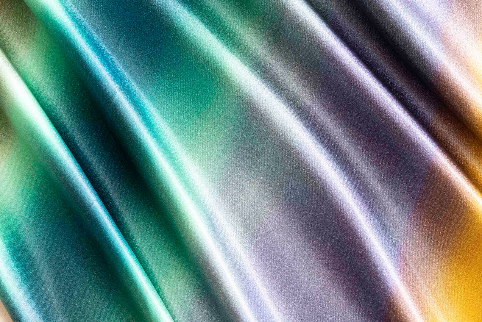 Prints are a treasure chest containing sought-after and very diverse bases: silk-wool double-faced lamé cady, organza with surfaces moved by bouclé yarns, silk-Nylon cloqué, lamé taffetas and devoré raw velvets are examples.
