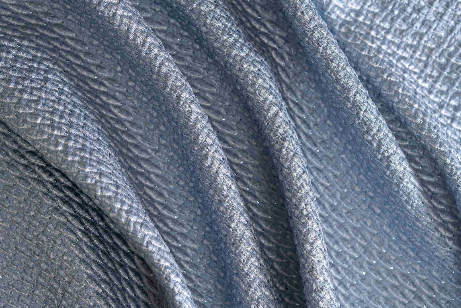 The wires left untied create and reflect lights; they are colorful and precious jewel-mesh. - Cloqué Fabrics – The contradiction between the visual experience of rigidity and softness to the touch is represented in the part of the collection dedicated to three-dimensionality and thus the structure of cloqué fabrics. The 3D surfaces present a contrast between swollen and hollowed out parts, visually rigid but, by contradiction precisely, soft to the touch and stretch for greater comfort and to follow the volumes of the body.