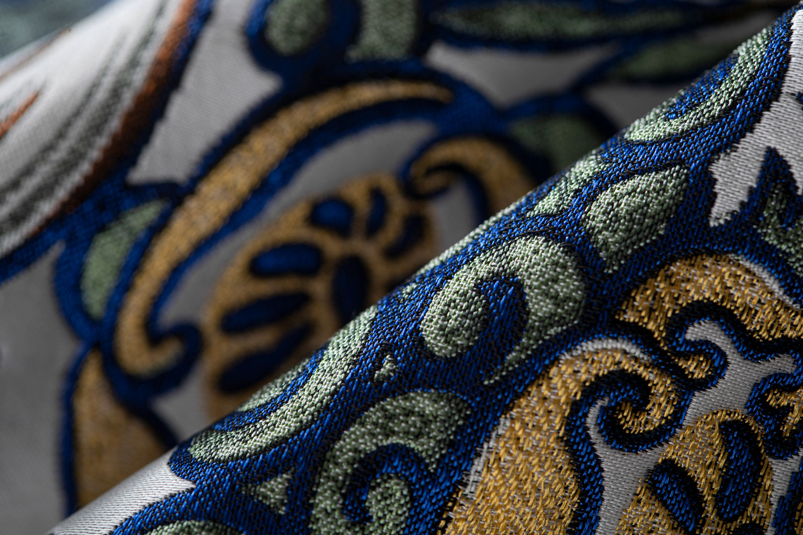 Matera, the city where white reigns, has inspired a theme of jacquard cottons on a gauze base and satin fil coupé, where the technical and snappy finishing enhances the dominant white, interrupted by touches of intense and vibrant colours.