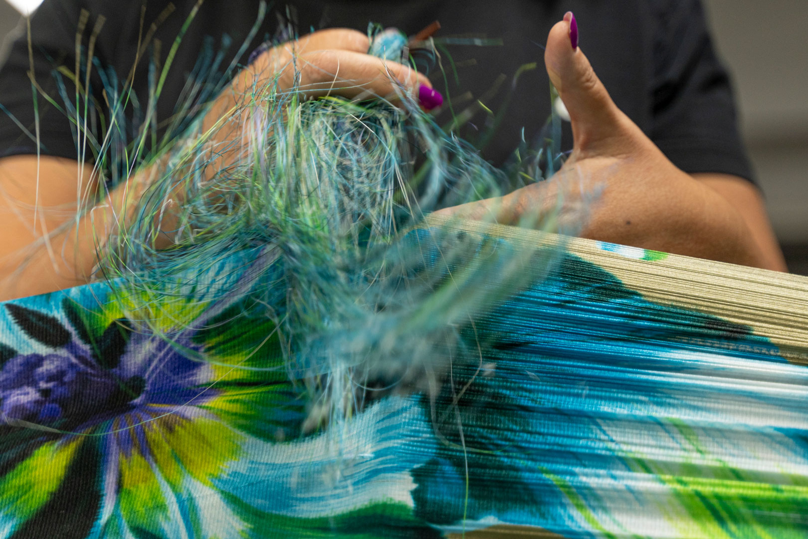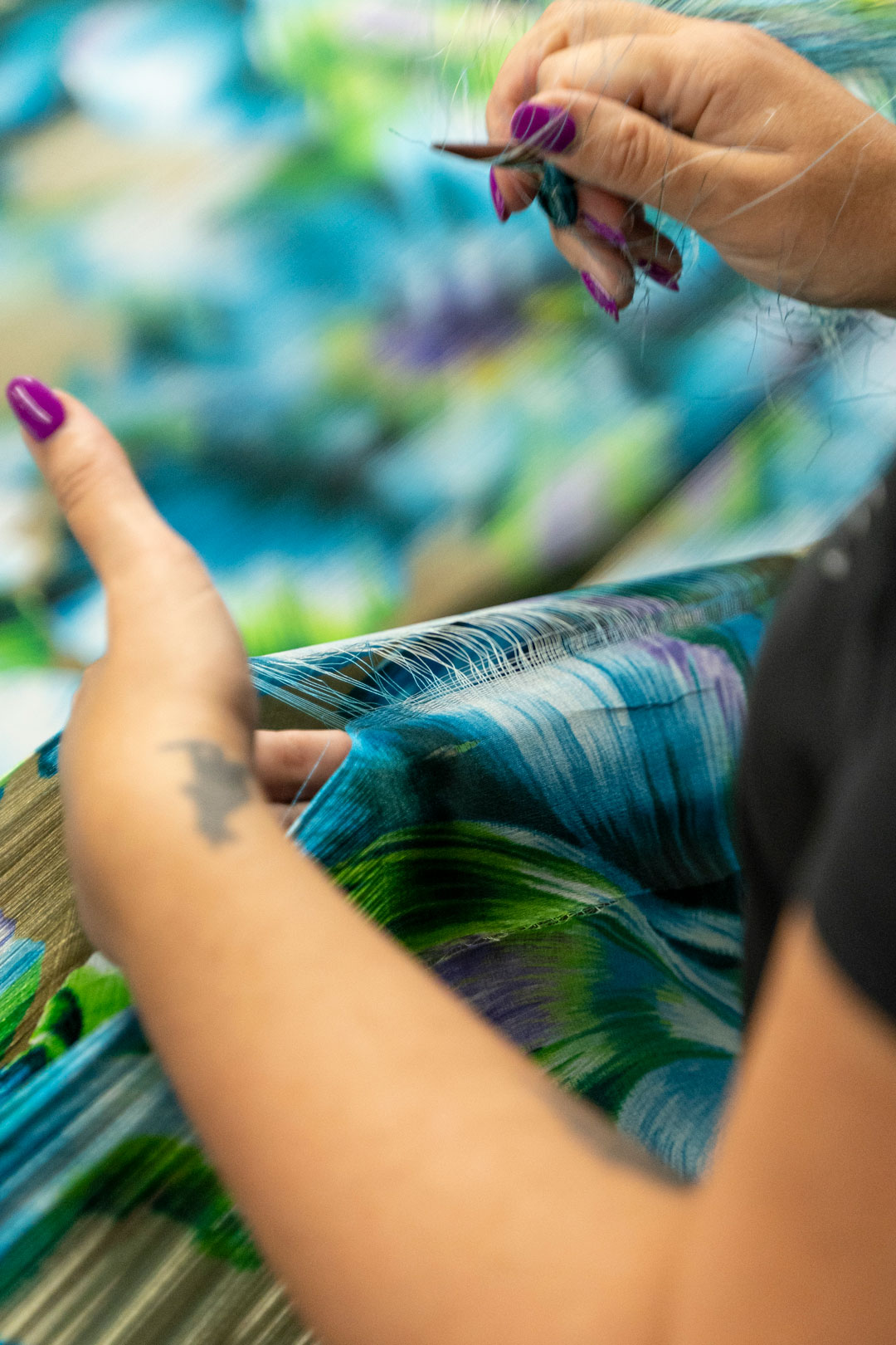 To emphasize its creative value, each fabric has been framed like a work of art by a decoration that recalls motifs found on antique sewing machines, reproduced on the surfaces with techniques such as innovative laser cutting, or embroidery and workmanship integrated into the fabric itself.