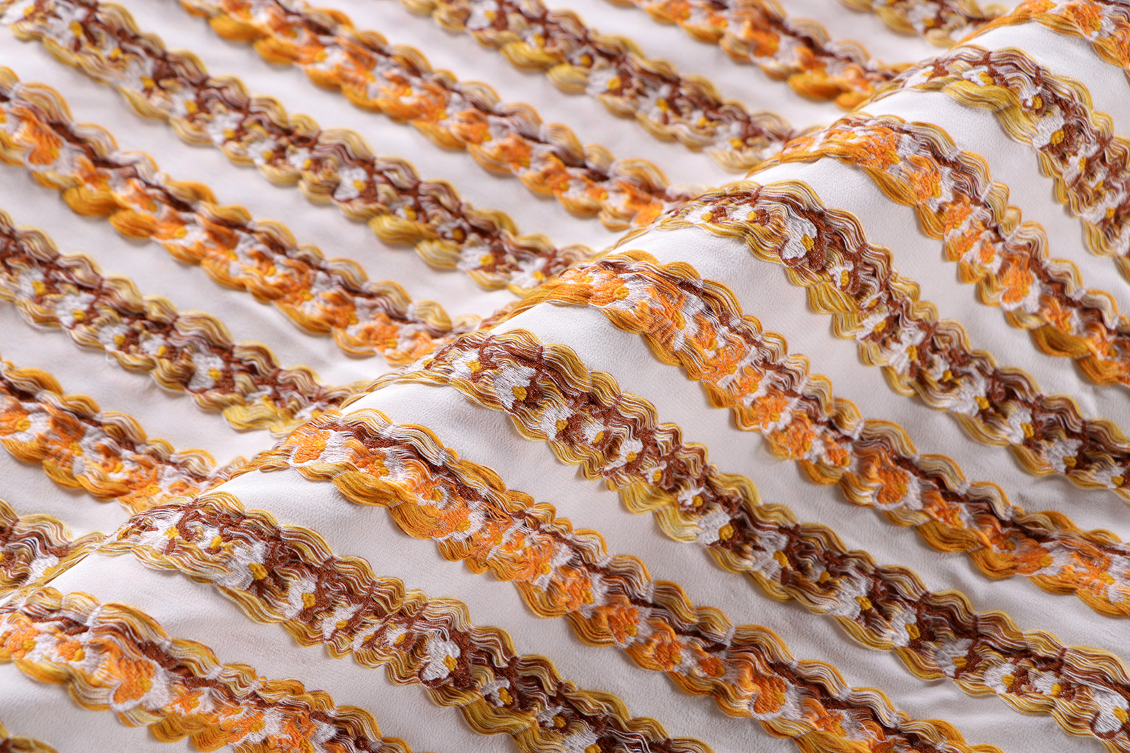 Within the collection, you’ll find transparent polyurethane fabrics with three-dimensional graphic prints, jacquard effects on cotton voile reminiscent of the geometries of the monuments in those lands. Warm and intense colors, finishes that give the fabrics soft and fluid hands.