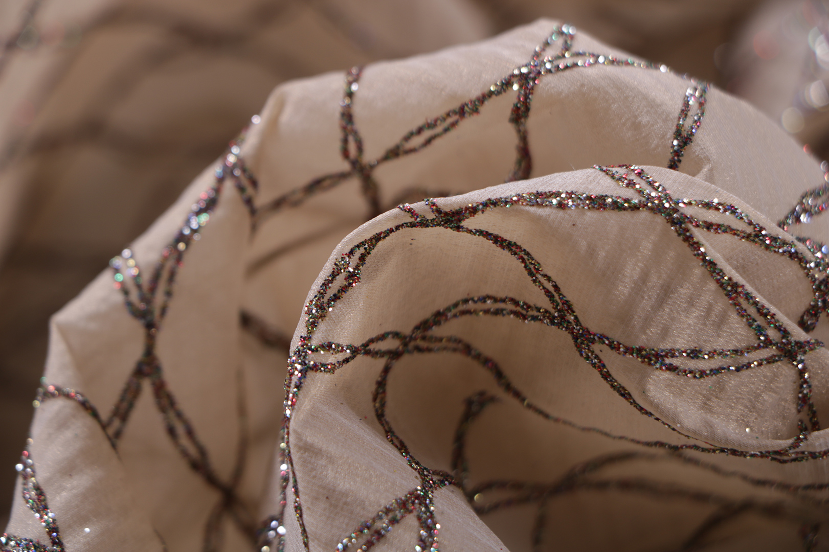 This metaphor is translated into the textile world through fabrics of high craftsmanship, a heritage of the company’s savoir-faire. Discover refined chiné fabrics presented in a modern and innovative way. Reinterpretations of classic silk bases such as duchesse, faille, and taffetas using modern yarns like steel, buttoned yarns with lamé, and fine cotton. Precious and intricate jacquards, including cotton organdy with cinched fil coupé, colored raffias creating virtuous weaves, and playful lamé stripes that resemble metallic armor.
