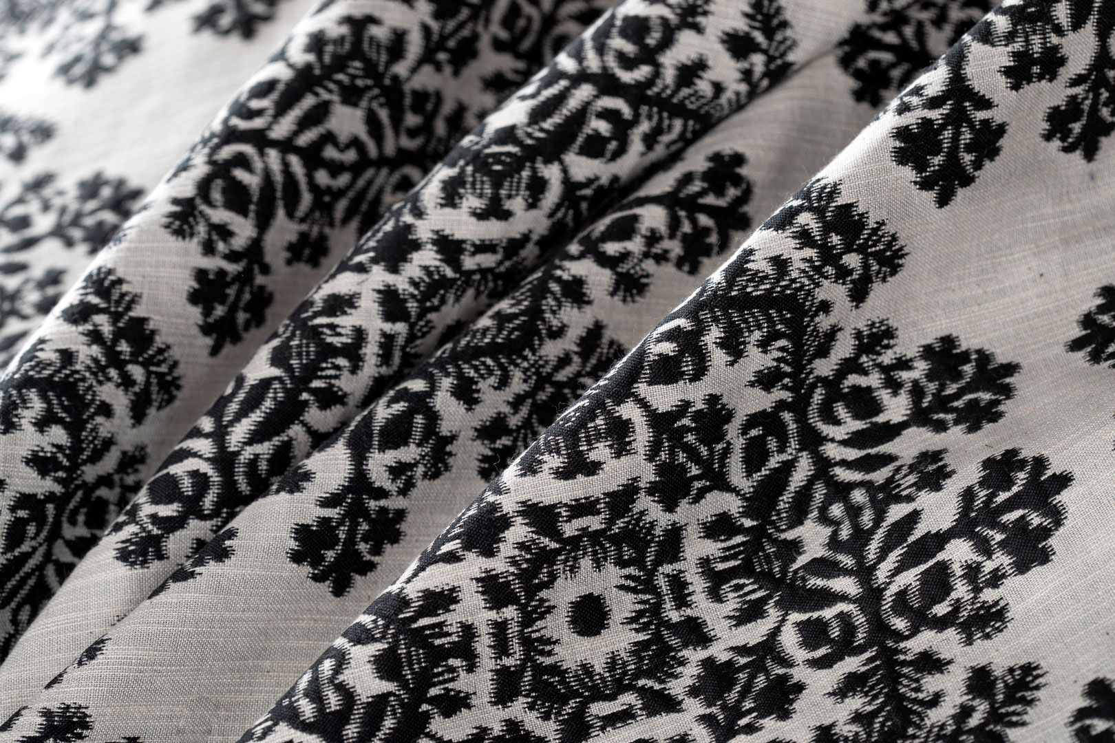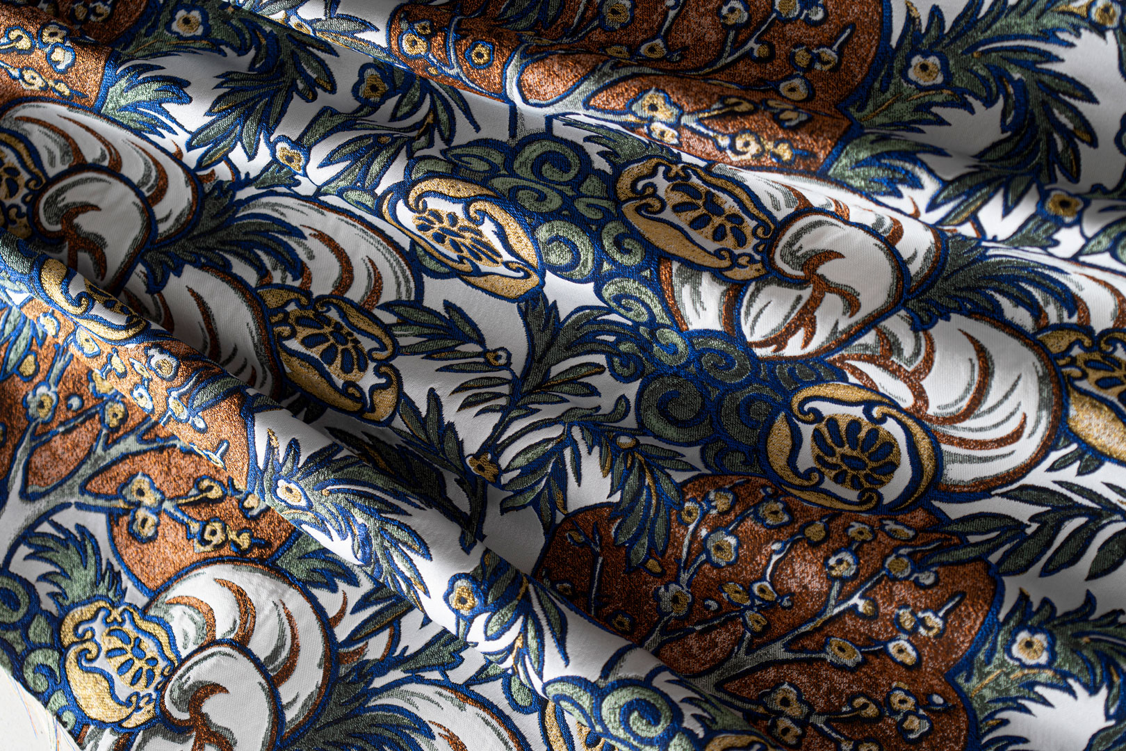 Doppi crepon in seta – cotone con disegnature filiforme ispirate ai decori delle città.