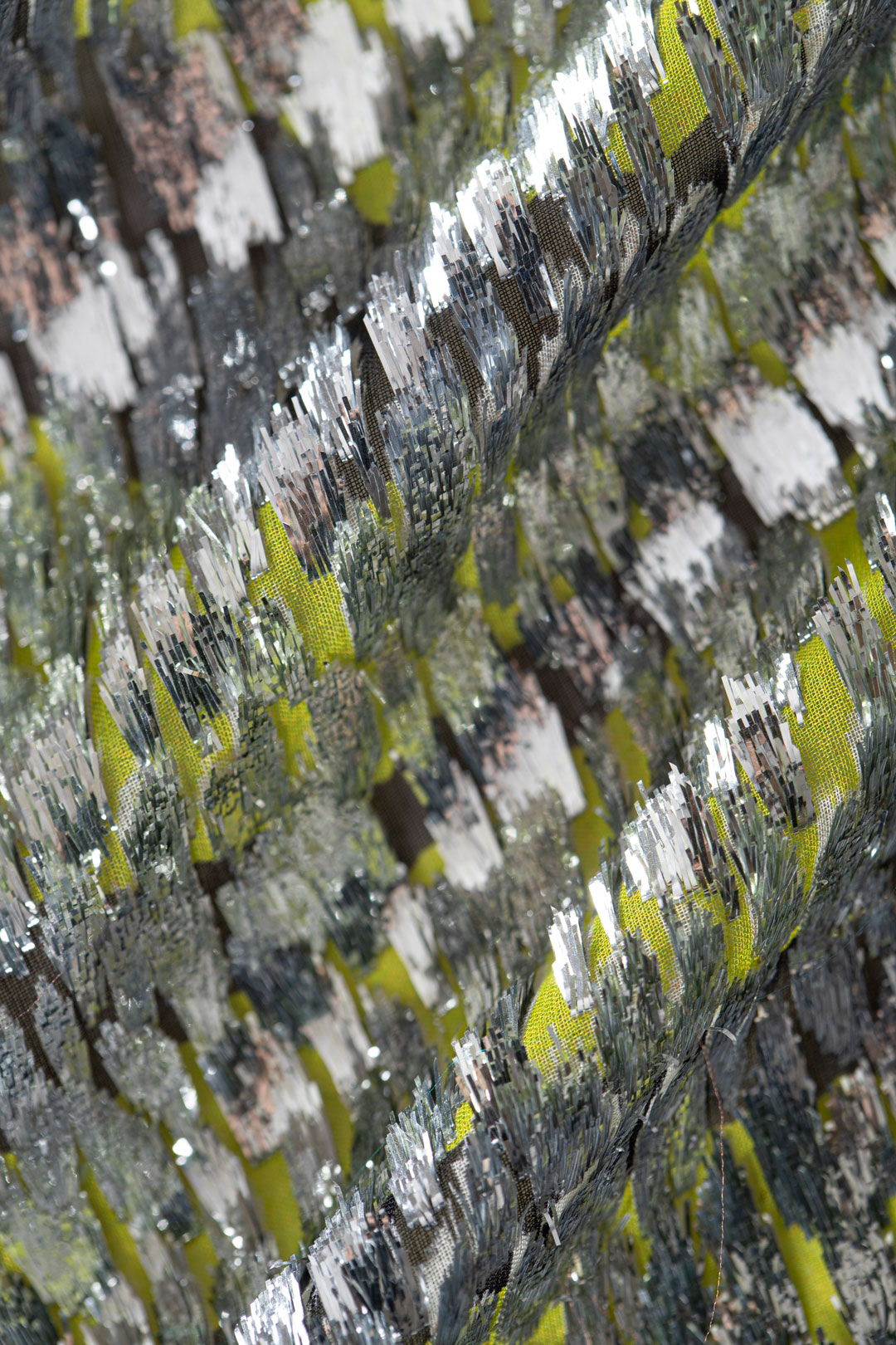 La disegnatura con effetti di macro intrecci ha cromatismi multicolor realizzati con cotoni e lini di grossezze diverse, per un risultato finale di tridimensionalità e rilievo.