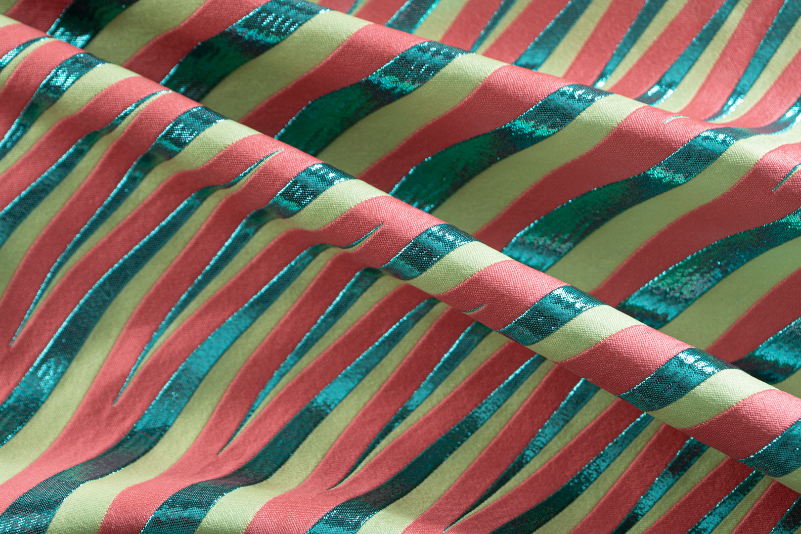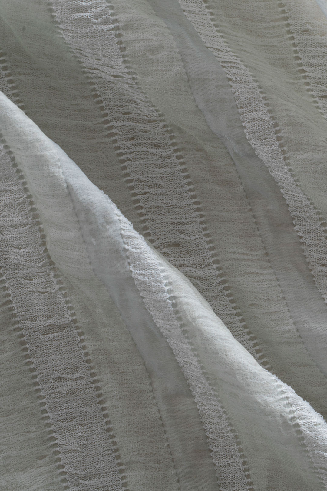 Venezia è un tema etereo di leggerezza e trasparenze nostalgiche, chiffon e georgette di seta con motivi fil coupè e con l’inserimento di filati di tulle per interpretare giochi d’acqua della laguna.