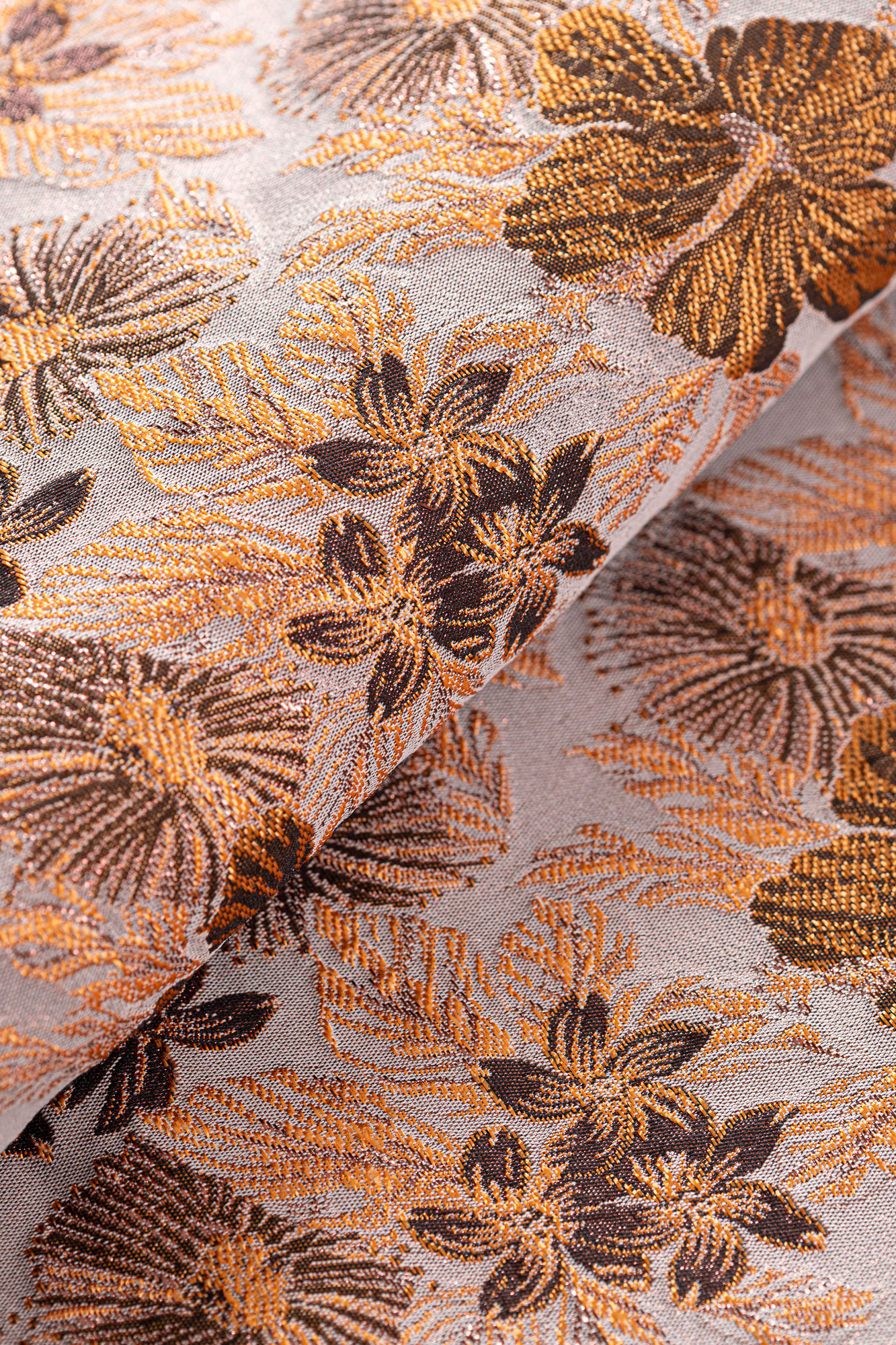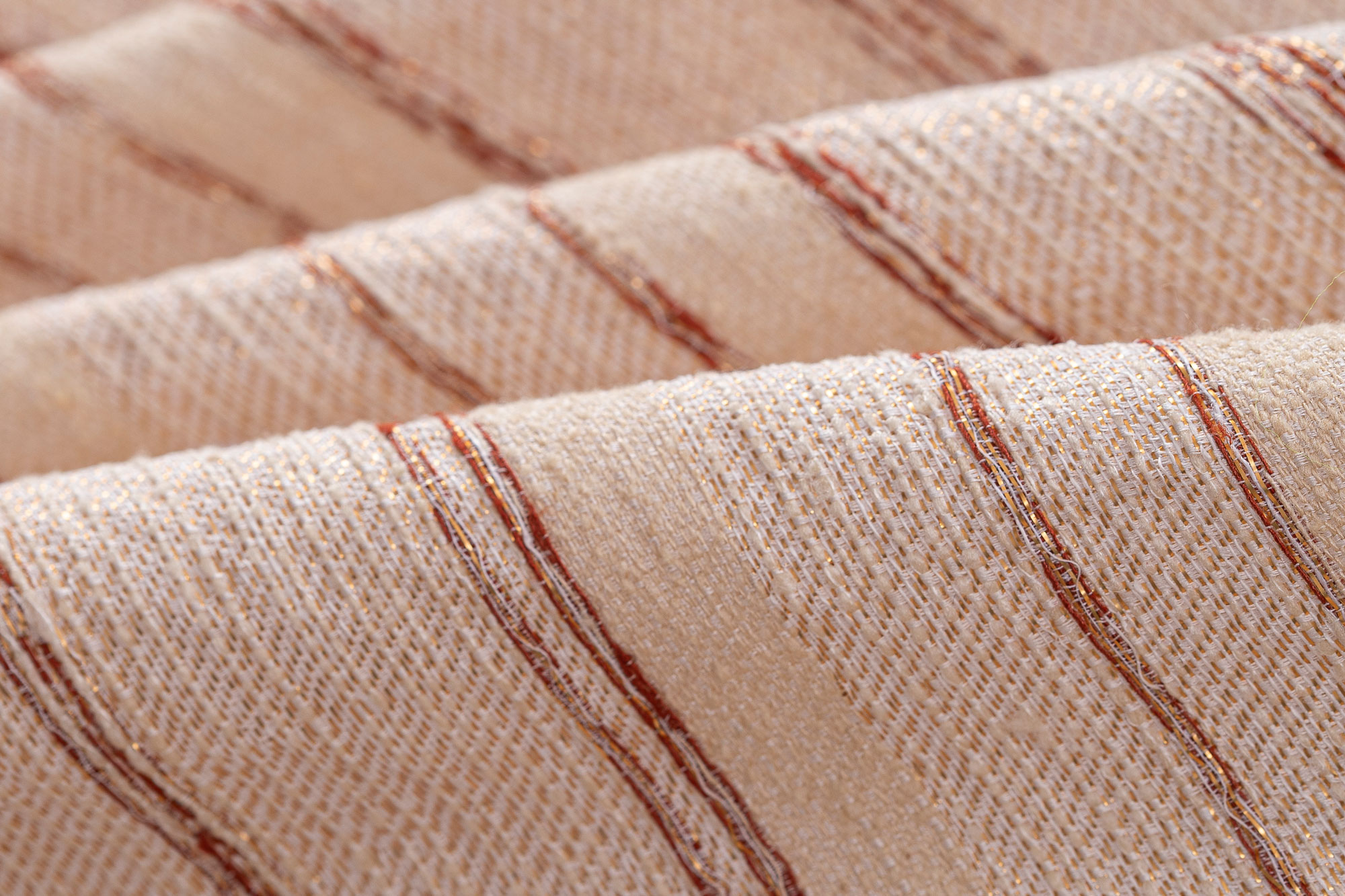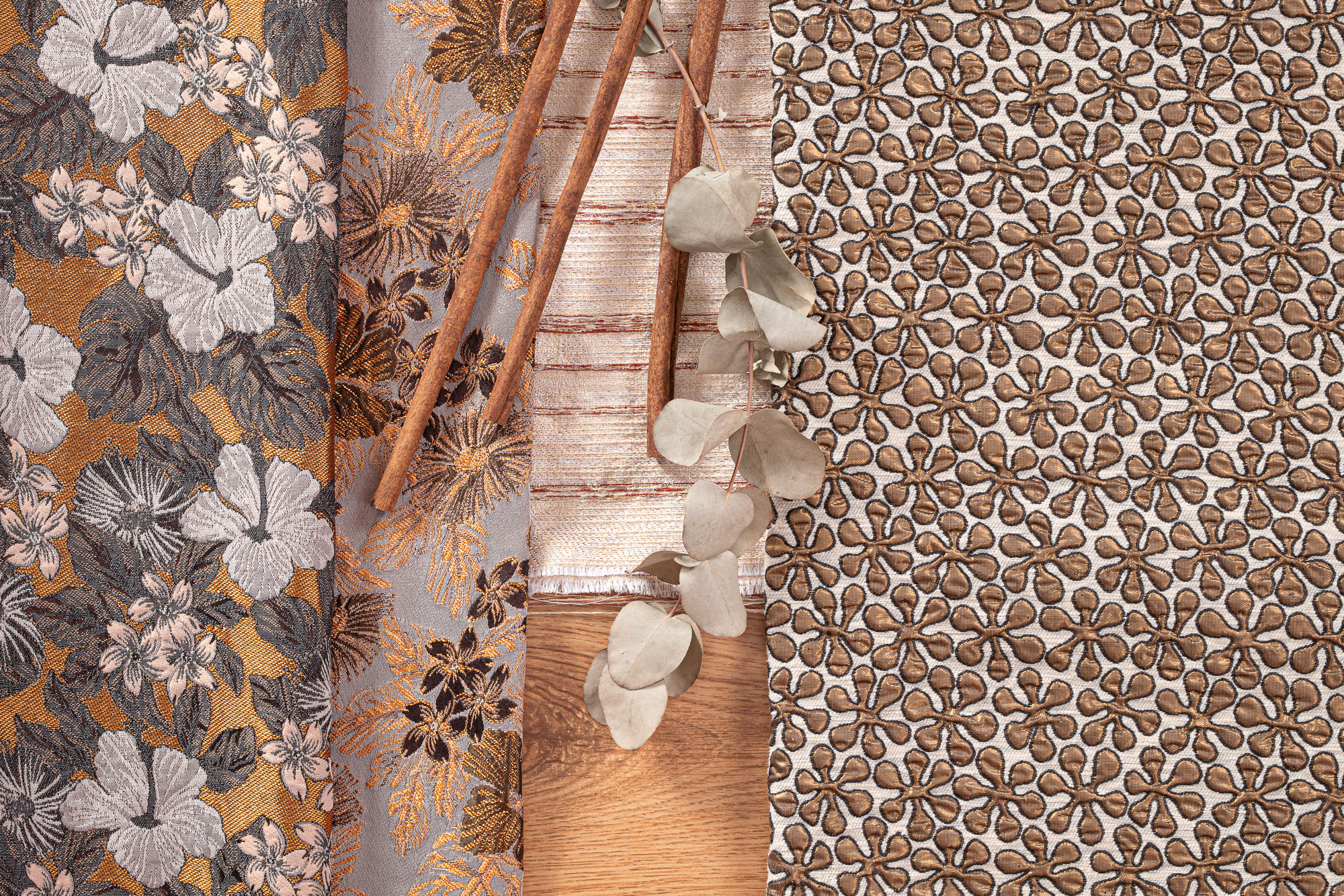 Un filo discontinuo prodotto con una mescola seta e lino certificato GOTS ottiene tessuti dalla fiammatura irregolare esaltandone la preziosità attraverso inserti di fili metallici e lurex gold.