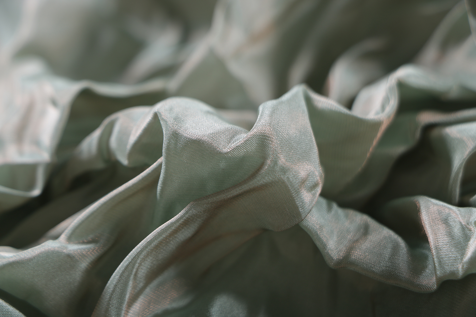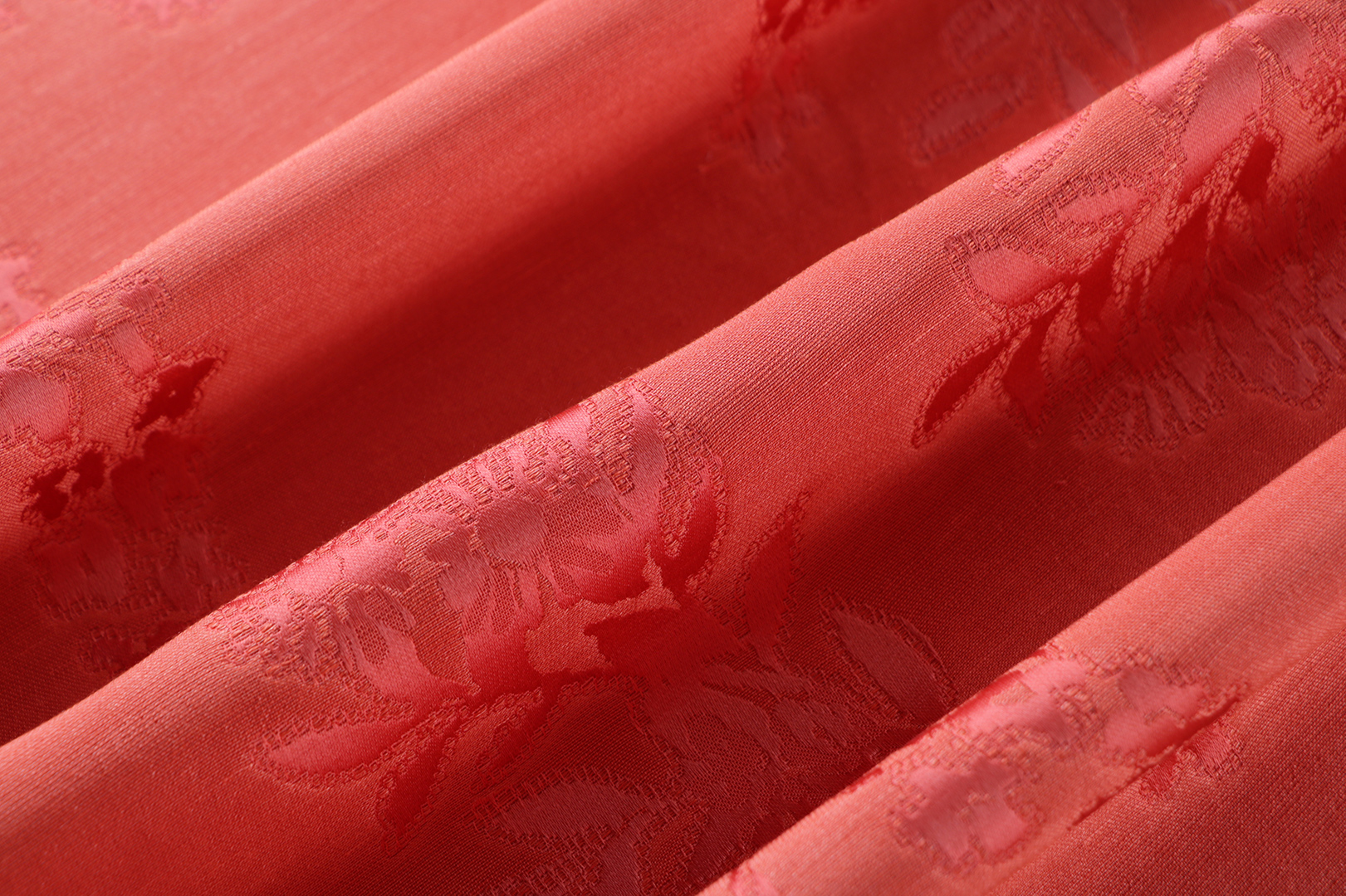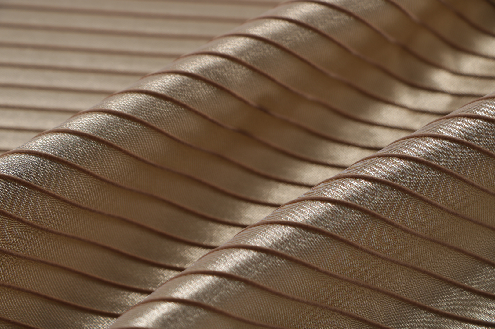 Analogamente, ogni tessuto della collezione è concepito per uno scopo specifico: crepe de chine con superfici delicatamente mosse o jacquardate per le camicie, taffetas leggerissimi arricchiti dai riflessi del rame, organze con mani lavate. Per i capi spalla, presentiamo duchesse con disegni jacquard incisi nei tessuti e filati bottonati che creano movimento sulle superfici di tessuti double face.