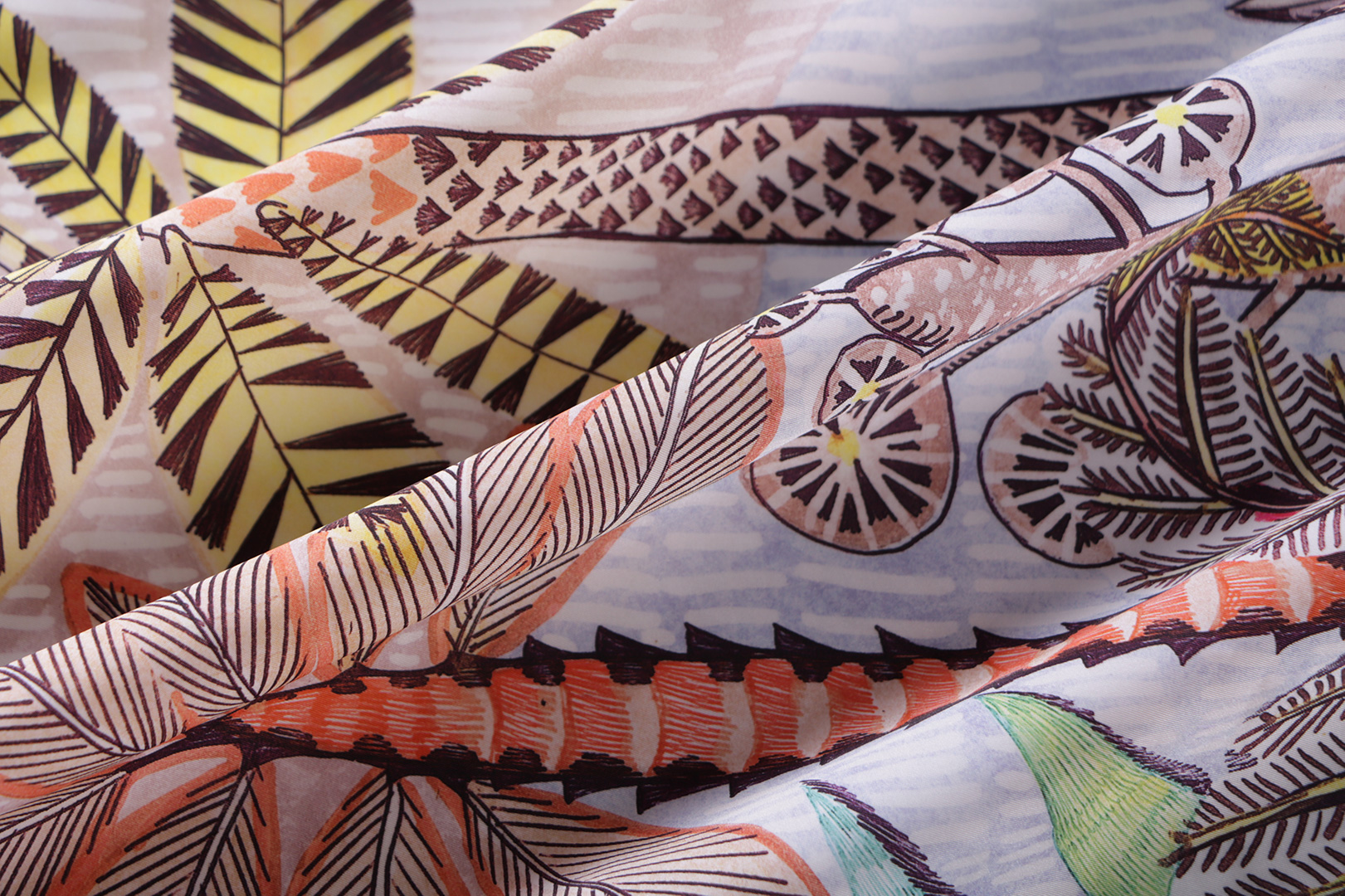 Le stampe completano la proposta con svariate basi dalle composizioni naturali, quali seta e tussah dalle superfici mosse, impreziosite da disegnature dedicate e rifinite con tecniche e finissaggi che ne esaltano le peculiarità e l’eleganza.