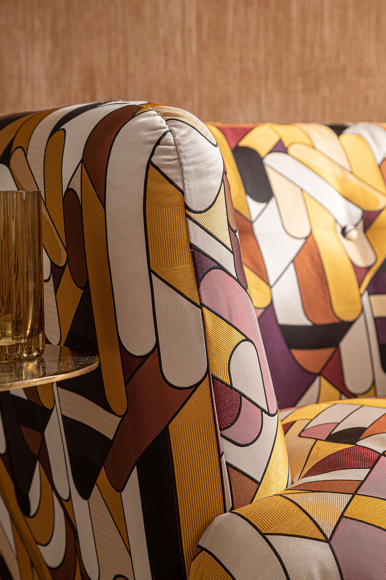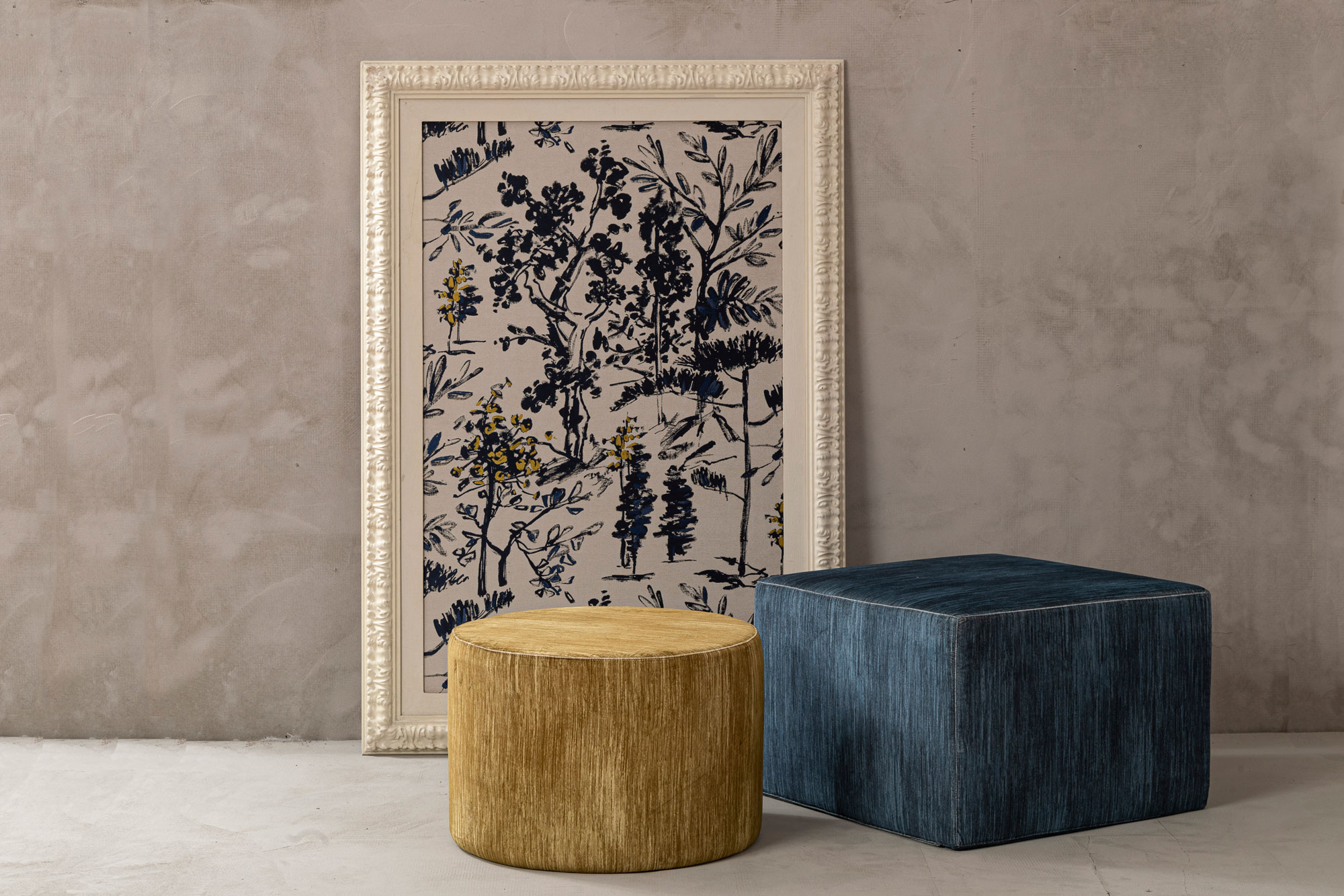 Tra i velluti troviamo un falso unito stampato su cotone, proposto in diciassette calde tonalità e un preziosissimo velluto a bacchetta in seta con disegno geometrico/figurativo che crea un’affascinante illusione ottica.