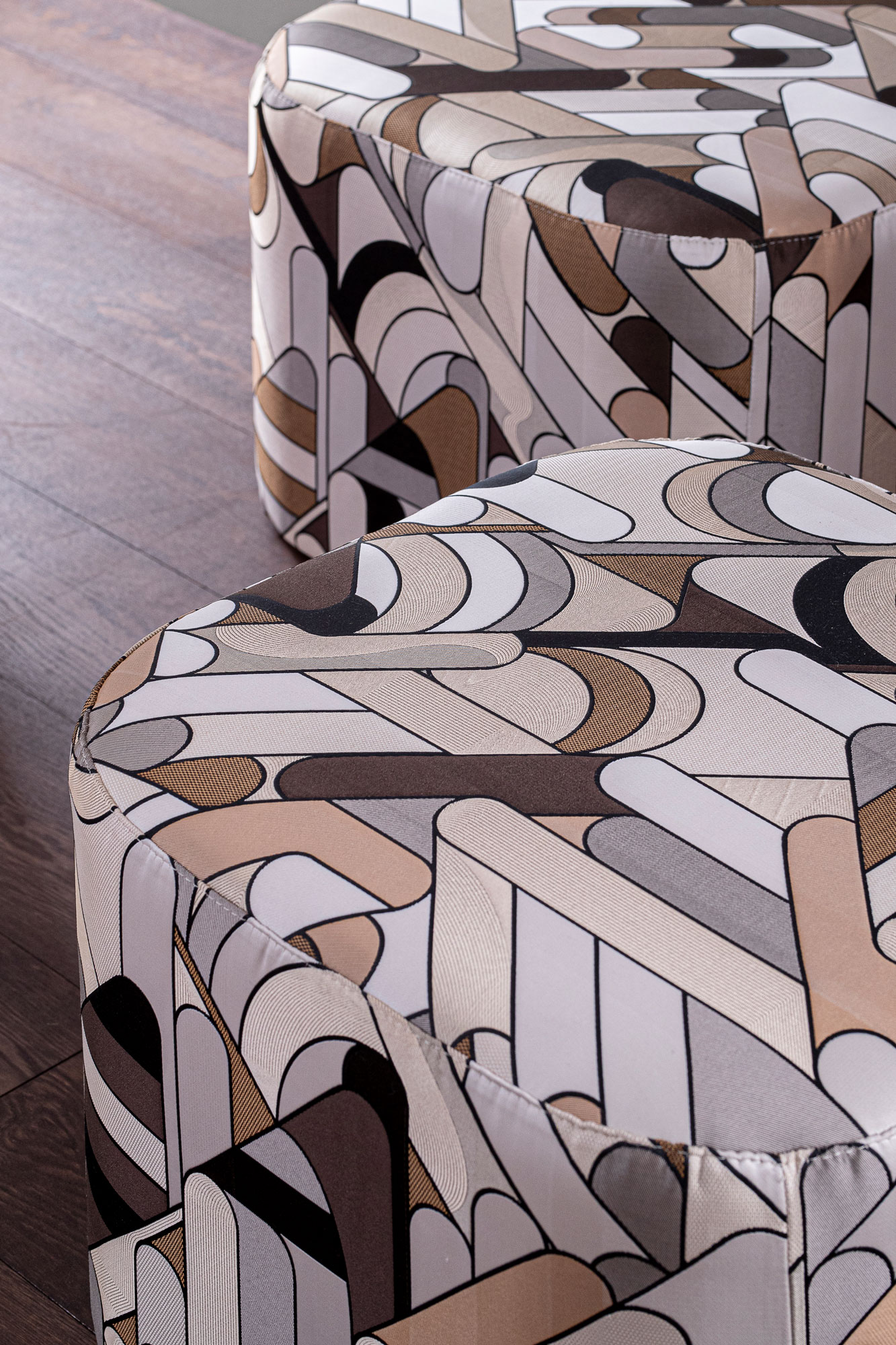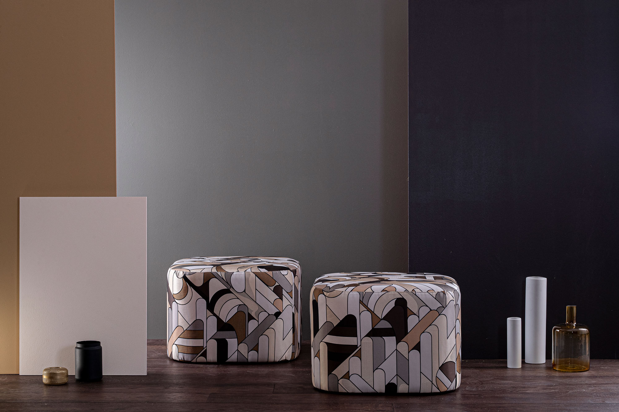 I tessuti outdoor completano la collezione con un motivo geometrico, una riga e una fantasia tropicale con elementi astratti, declinati su fondi di tre diversi pesi per realizzare imbottiti, cuscini o elementi decorativi.