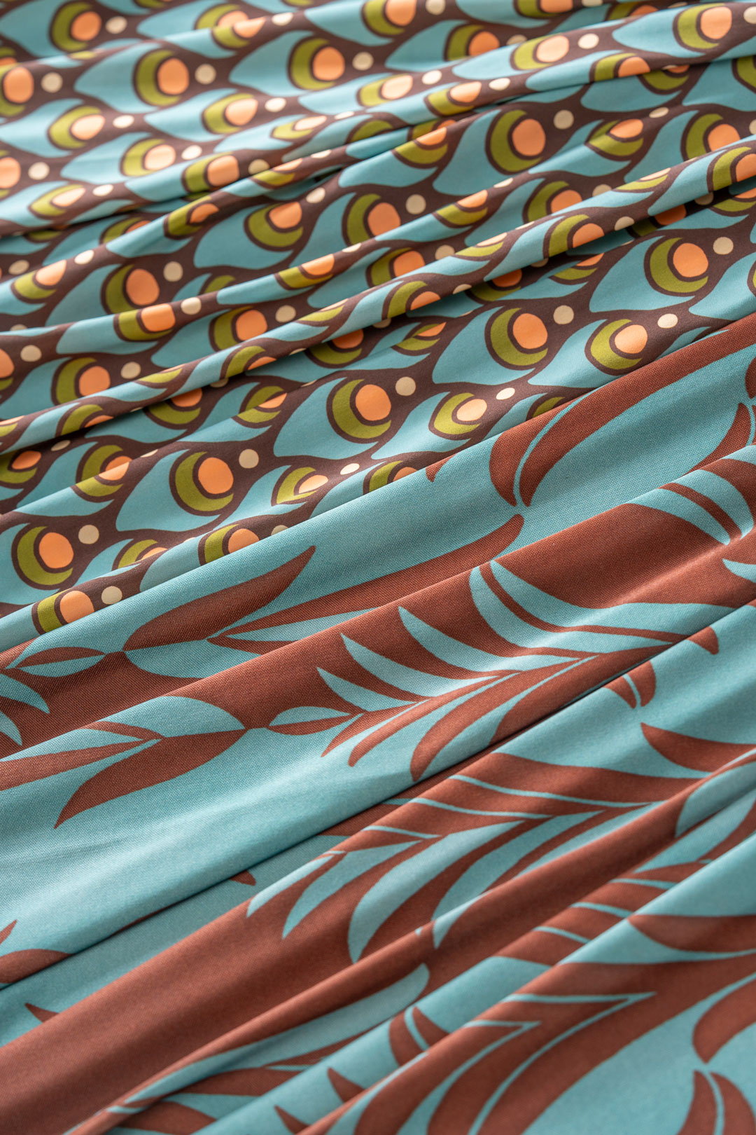 - Tema geometrico: presenta fantasie monocolori e bicolori sviluppate sia su microfibre per costume da bagno, sia su fibre naturali quali popeline e voile di cotone biologici certificati GOTS e tele di lino certificate European Flax®.
