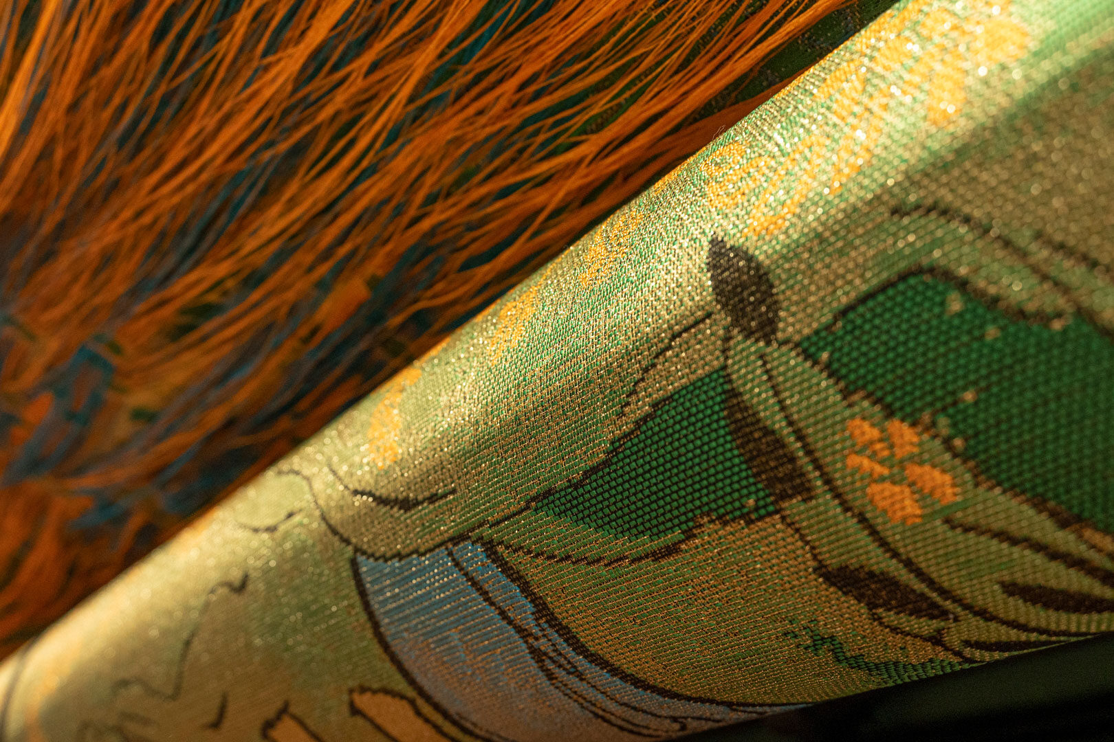 Ogni tessuto parte della capsule è espressione di un virtuosismo tecnico e stilistico: tra questi spiccano dei “grandi classici” che rappresentano l’essenza della Clerici Tessuto: preziosi velluti con illustrazioni di scene naturali fuori scala; ricercati chinè con vivaci disegni di ispirazione naturalistica, declinati “fuori misura”, con un effetto al limite tra il figurativo e l’astratto; lavorazioni jacquard di grande pregio, valorizzati nella capsule su strutture molto particolari, ovvero reti metalliche sulle quali vengono realizzati disegni materici ricchi di dettagli.