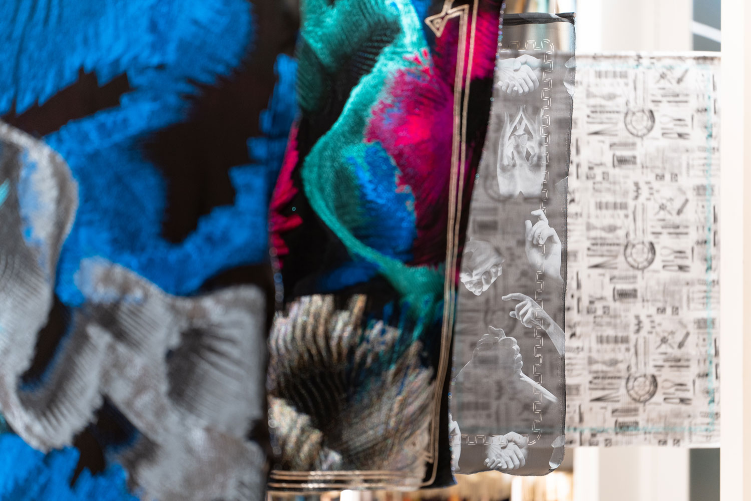 Nella capsule troviamo anche due tessuti che si pongono come simbolico ringraziamento a tutte le maestranze che fanno e hanno fatto parte della storia di Clerici Tessuto. A celebrare un lavoro che passa di mano in mano sono proprio delle mani, intrecciate o impegnate in gesti e movimenti, ad essere stampate con una innovativa tecnica su un tessuto Mirelle, prodotto iconico dell’azienda, e su organza di seta. Le mani sono stampate in bianco e nero e rese con particolari lavorazioni e pigmenti, restituendo un sorprendente effetto chiaroscurale.