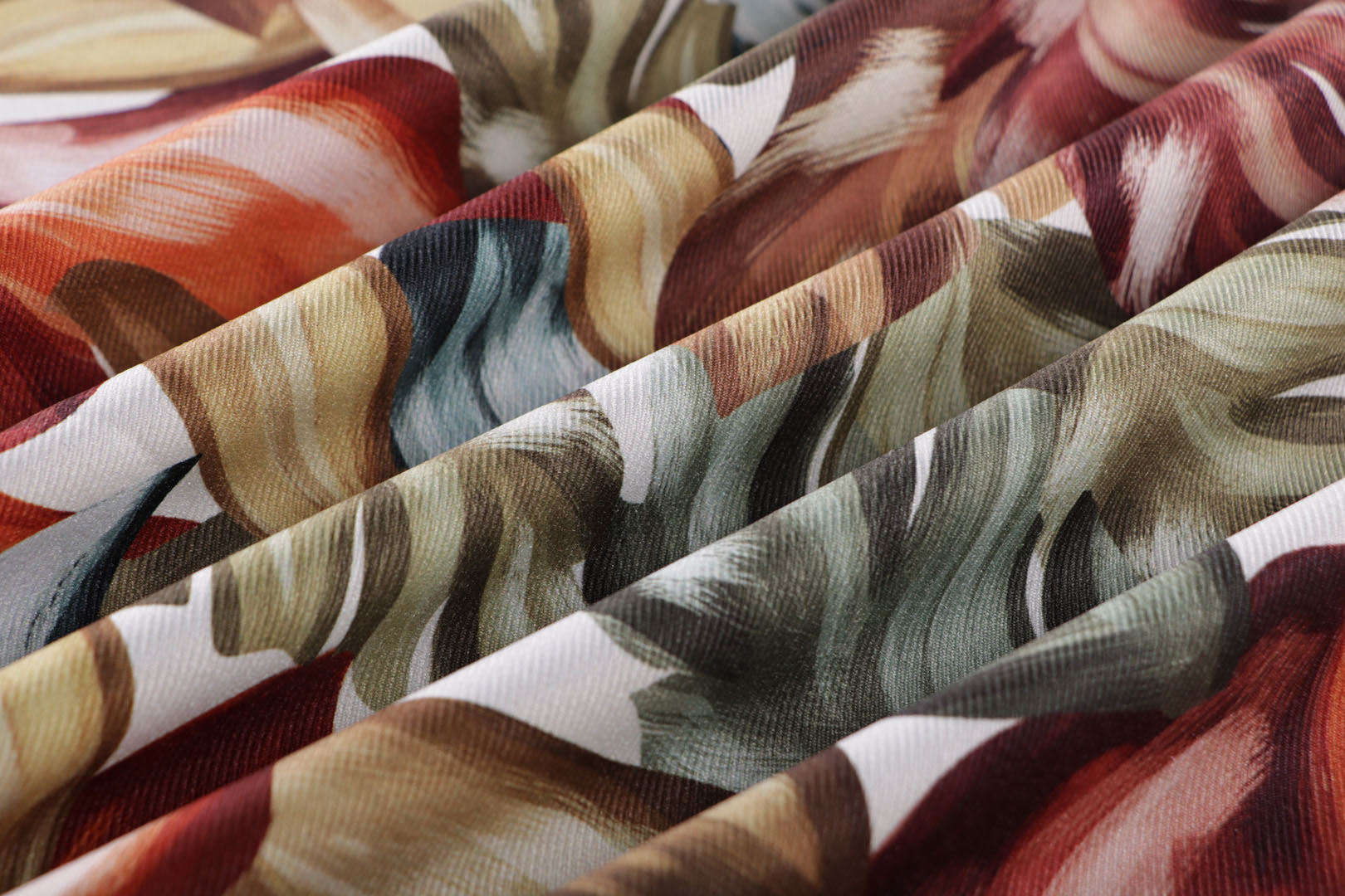 Le stampe completano la collezione con molteplici basi, quali: organza stampata e cinzata, faille di seta jacquard, basi fluide di lamé con foglie astratte, duchesse con superfici insolite, plissé che conferiscono movimento e tridimensionalità ai disegni.