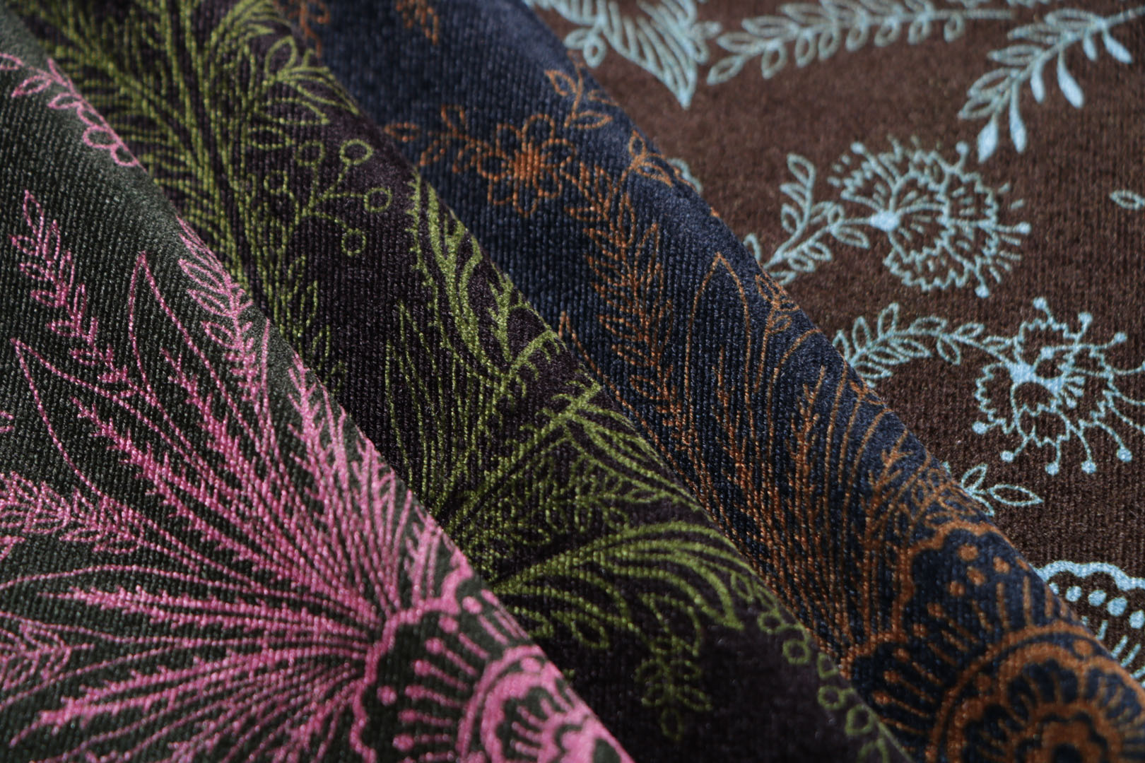 Questa stagione, i nostri velluti di seta, eccellenza dell’azienda, prendono forma su basi strutturate e rotonde, con disegni che spaziano dai motivi geometrici ai floreali estremamente femminili.