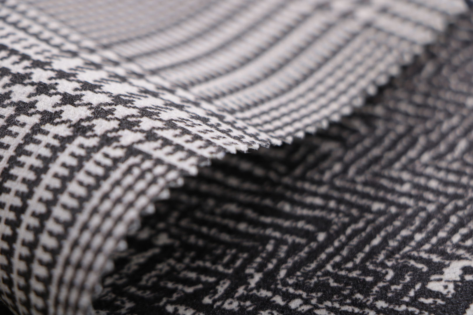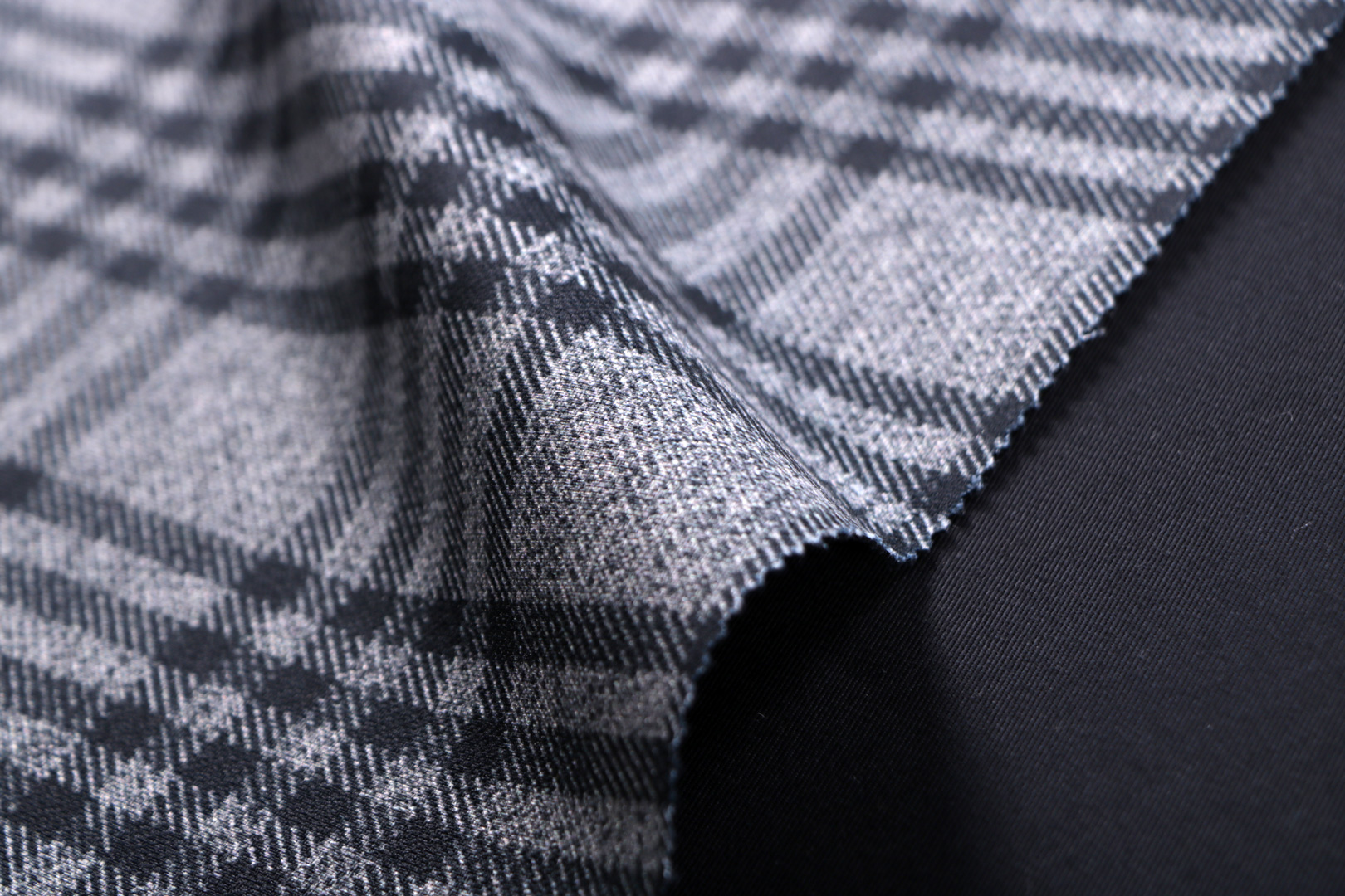 Una parte significativa della nostra ricerca grafica è stata dedicata ai check e ai disegni jacquard scozzesi. Troviamo quindi scozzesi ondulati, fluidi, con linee mosse e a rilievo, oltre a ripstop fantasia, che escono dal mondo del tessuto propriamente tecnico e vengono presentati con fili di lana garzati su superfici cotoniere o seriche.